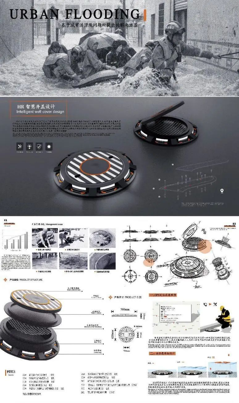 针对于目前时常发生的井盖“吃人”事件和突发的洪涝灾害等恶性问题专门设计了此款智慧井盖,该智慧井盖配备有GPS定位、太阳能照明、洪涝悬浮标提醒、以及双层防护网等具有人文关怀性功能设计。