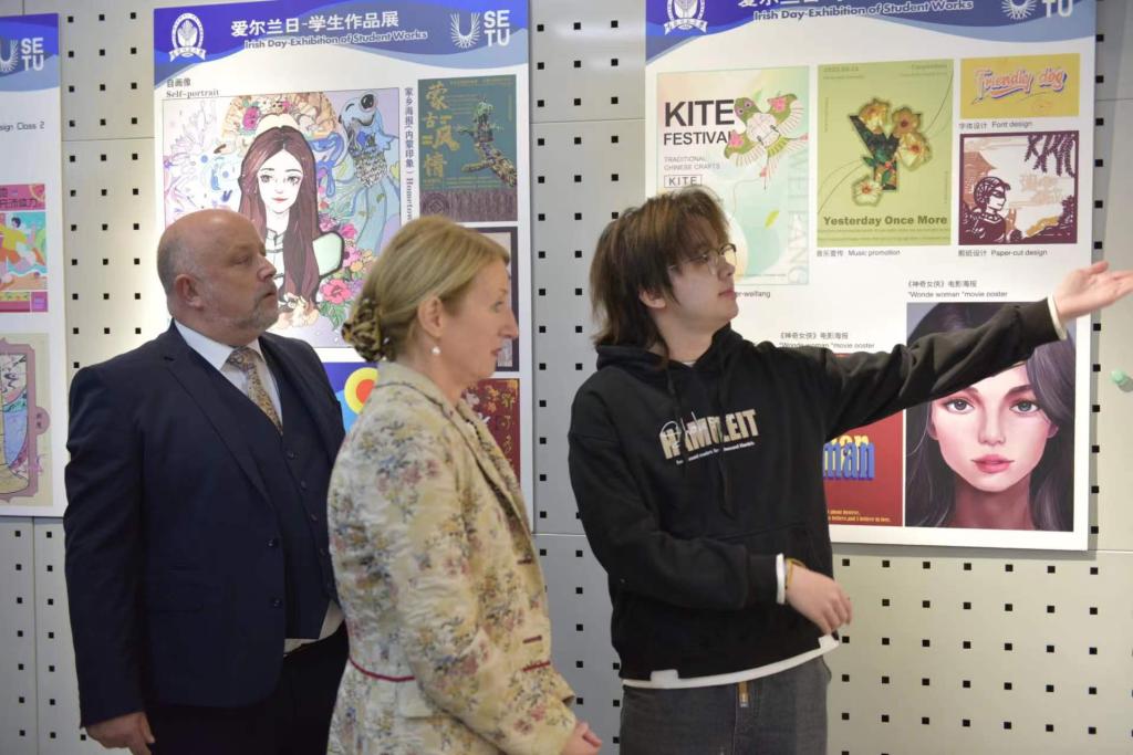 下午,澳门太阳成集团校领导及相关处事负责人陪同爱尔兰东南理工大学校领导及各位嘉宾到美术学院美术馆参观“爱尔兰日——学生作品展”。本次学生作品展分为学生作业、实践作品、获奖作品、毕业设计及实物展品五大类,充分展示美术学院视觉传达设计专业近年来的育人成效和教学成果。视觉传达设计专业优秀参展学生向来访领导介绍和讲解了展览作品,领导们与学生进行了亲切的交流与互动,并对学生作品给予了高度评价与赞许。