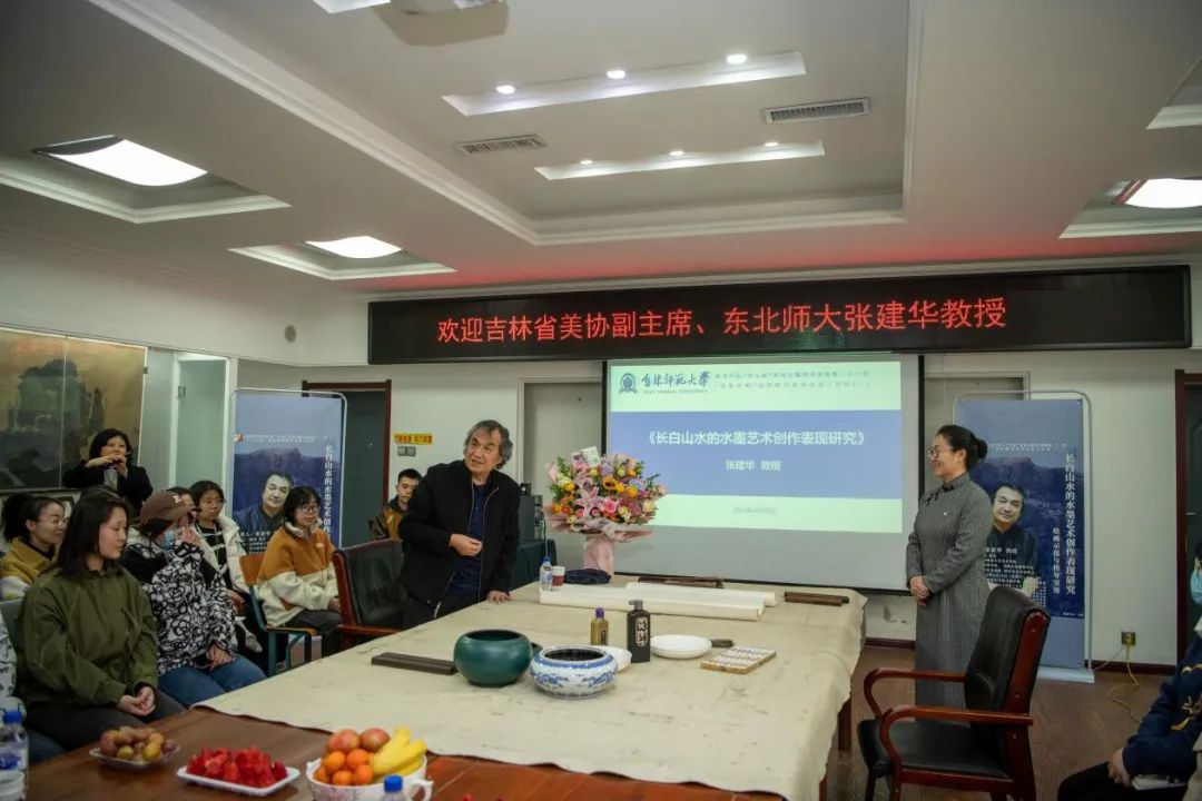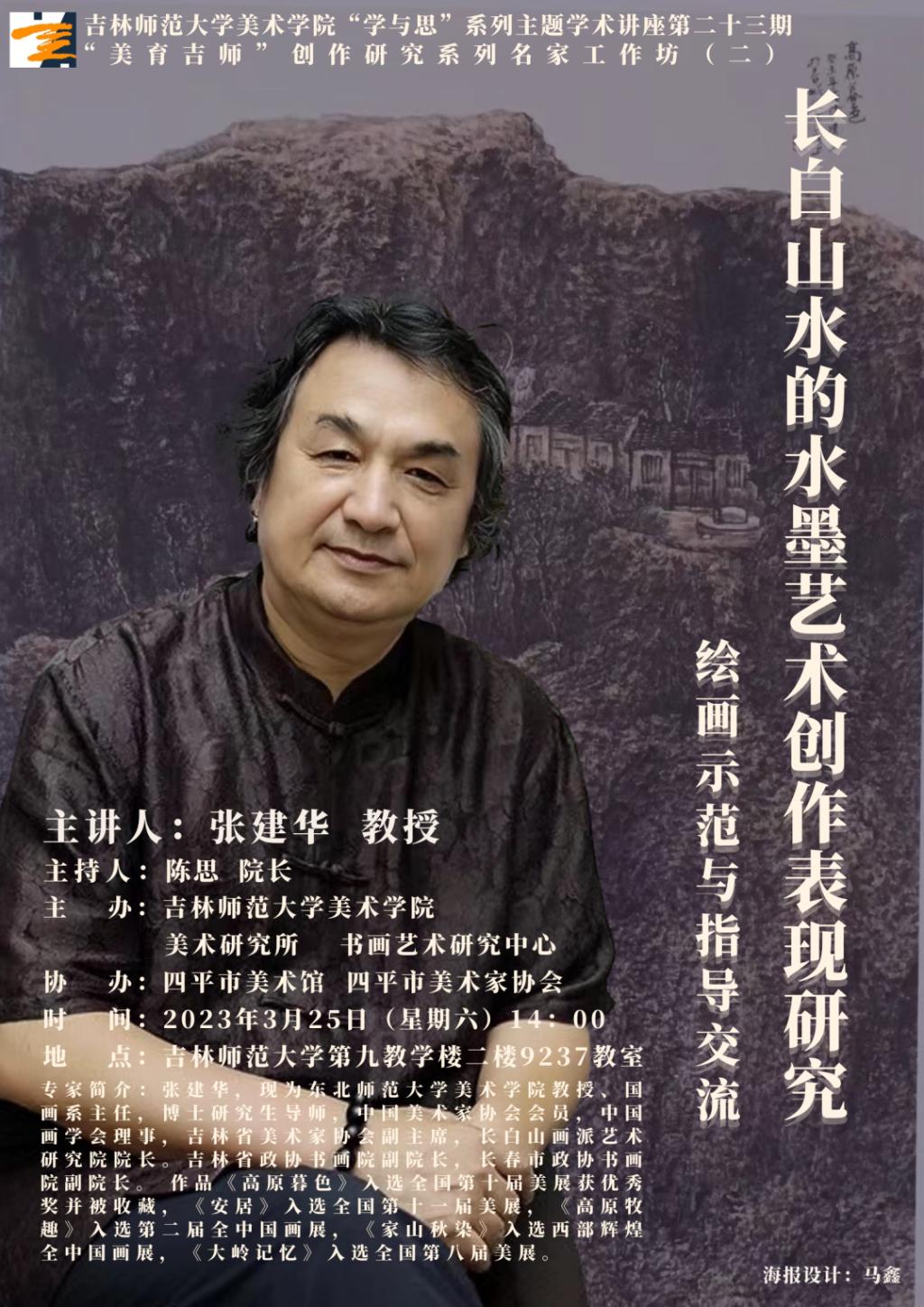 3月25日,东北师范大学美术学院教授、国画系主任、博士研究生导师,吉林省美术家协会副主席,长白山画派艺术研究院院长张建华教授应邀来到澳门太阳成集团美术学院,为师生们带来了一场主题为《长白山水的水墨艺术创作表现研究》的精彩讲座与创作示范。四平市美术馆馆长、四平市美协主席王小清等嘉宾莅临现场参与交流。活动由美术学院院长陈思博士主持。