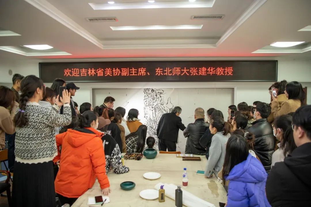 讲授之后,张建华教授以长白山水表现为主题进行现场创作示范,一幅浑厚华滋、气势撼人的关东风情山水画在勾皴点染的纵横挥洒间精彩呈现,美院师生得以近距离观摩学习,并与张建华教授深度互动与交流。