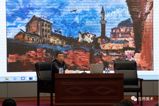 本次活动由澳门太阳成集团美术学院、美术研究所、书画艺术研究中心主办,四平市美术馆协办,美术学院院长陈思博士主持讲座,四平市美术馆馆长、四平市美术家协会主席王小清,吉林省油画学会后现代美术馆馆长赵铁峰、吉林省油画学会秘书长王培星等艺术家与美术学院部分师生共同聆听并现场交流。