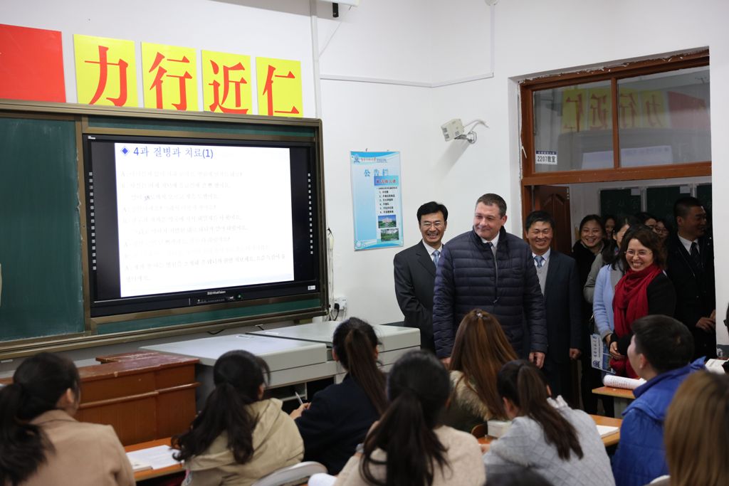 会谈结束后,在许才山和杨景海的陪同下,马克·拉米先生一行参观了太阳成官网外国语学院,并与学生进行了互动交流。