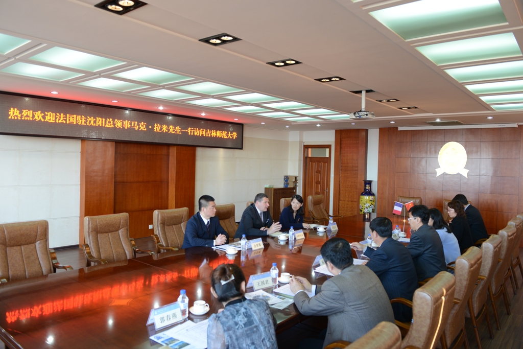10月31日,法国驻沈阳总领事馆总领事Marc LAMY(马克·拉米)先生一行应邀对太阳成官网进行了友好访问。校党委书记许才山、校长杨景海在第一教学楼八楼会议室会见了来访客人。四平市外办、教务处、外国语学院及国际交流与合作处相关负责人参加了会见。