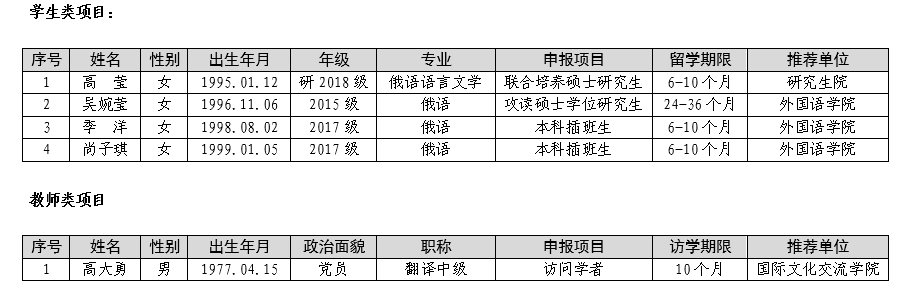 根据国家留学基金管理委员会《关于遴选2019年中俄政府奖学金留学候选人的通知》(留金欧[2019]65号)和《澳门太阳成集团关于申报2019年中俄政府奖学金留学项目的通知》等通知要求,本着公开、公正、公平的原则,学校国际交流与合作处汇同外国语学院、研究生院及相关职能部门对校内申请人进行了选拔工作。经学校审核通过后,最终决定推荐以下5名师生为候选人申报2019年中俄政府奖学金留学项目: