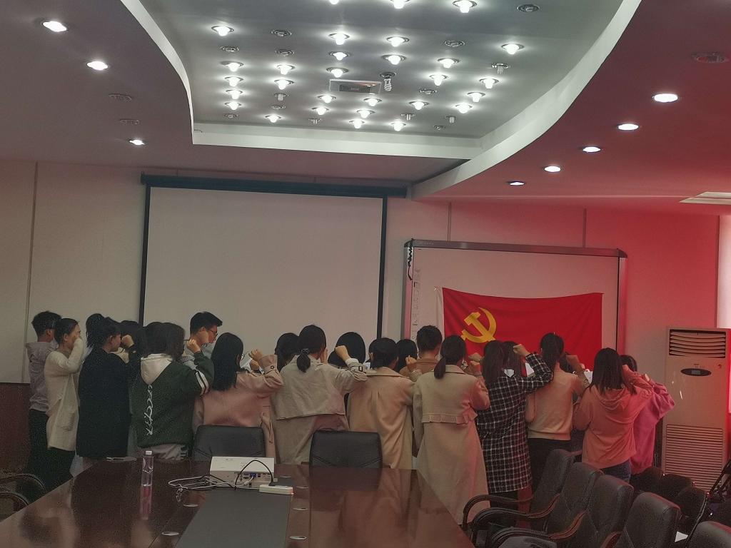 大会最后,共唱国际歌,全体预备党员面向党旗宣誓,展现对党的崇高敬意。