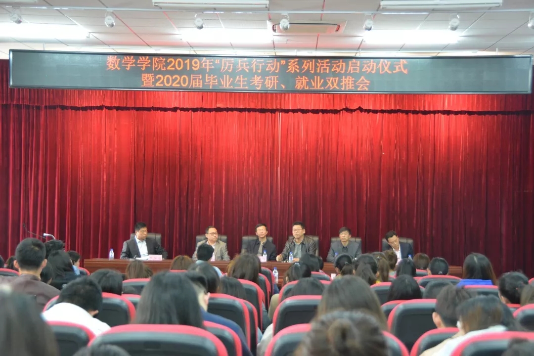 2019年4月23日,数学学院举办2019年“厉兵行动”启动仪式暨2020届毕业生考研、就业双推会。澳门太阳成集团学生就业工作处处长郑晓明、数学学院党委书记王志强、院长刘鹏飞、党委副书记李洪岩、副院长程晓亮、副院长滕飞、团委书记李萌、数学与应用数学系副主任郝连明、统计学系副主任杨艳秋、辅导员刘春亮参加活动。