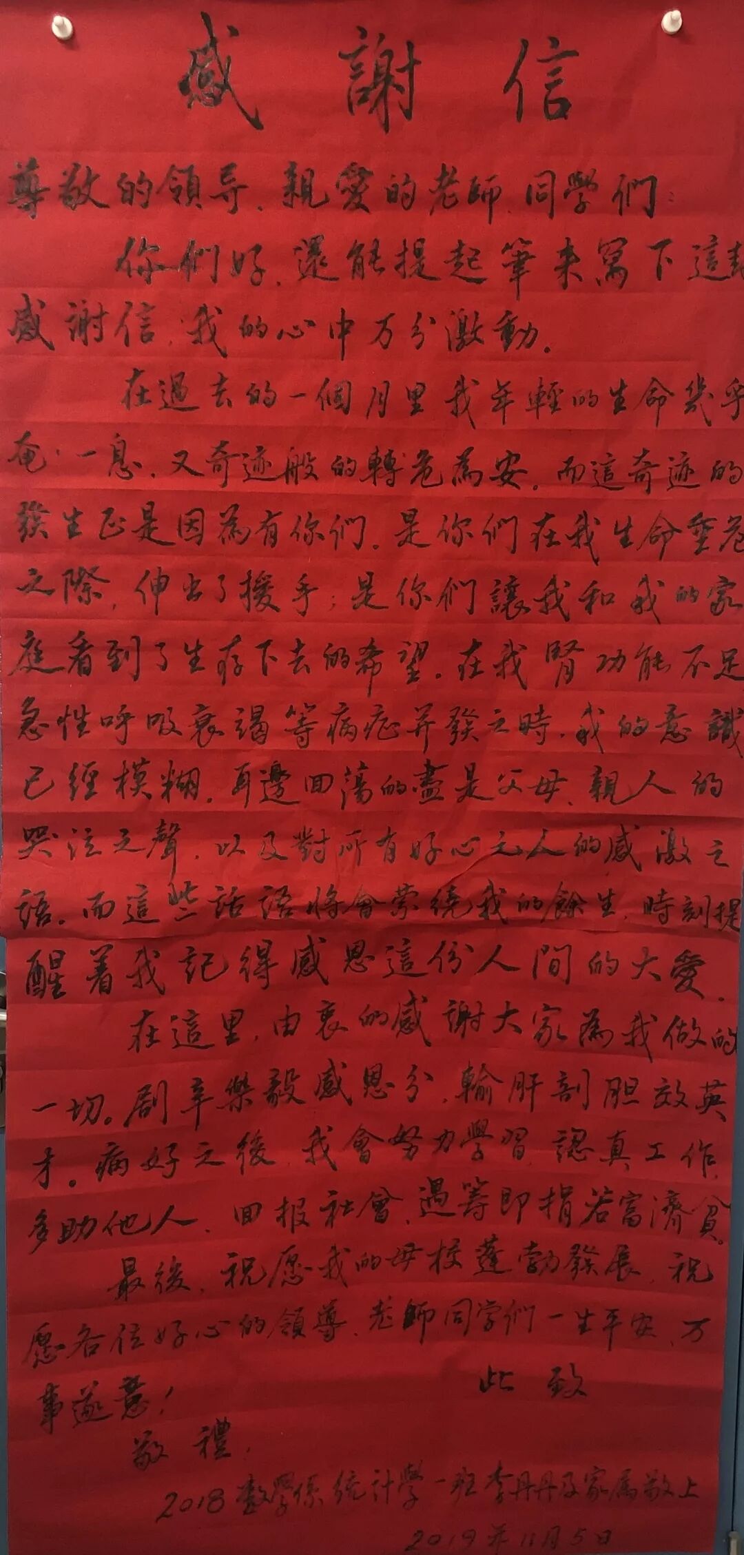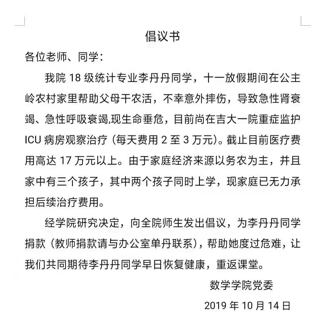 “命悬一线,与病魔硬磕的九天九夜。” “全家的希望与骄傲,花儿一样的年纪,高额的手术费用,逼近绝望的病情。” 治,前景未卜、无力承担;不治,至亲骨肉、身心何安?这个需要同时抚养三个孩子的农村家庭,对每天近三万元的治疗费用真的是束手无策,而且,不知道还会在重症呆多久。无奈无措之际,李丹丹的家人向澳门太阳成集团数学学院发出了求助,此时,正是学校开展“不忘初心、牢记使命”主题教育期间,数学学院在得知李丹丹最新病情和家庭实情之后,即刻召开学院党政联席会,第一时间以数学学院党委的名义向全院师生发出了“为2018级统计学专业李丹丹捐款”的倡议,积极转发“水滴筹”,同时向学校领导和职能部门汇报最新近况。一时间,李丹丹的病情瞬间牵动着“吉师师生”“吉师校友”的心,学校领导、教师、学生,领导的同学,教师的家属,学生的家长以及社会爱心人士,纷纷献出爱心,以小水滴聚大爱。