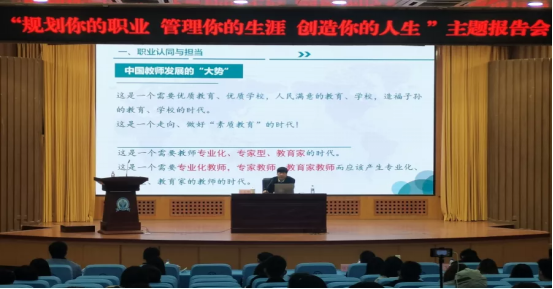 会上,王校长结合多年教学经验,对当前就业形势进行系统分析。他提出师范生要知晓市场竞争现状,提升职业认同,完善职业价值取向。王校长告诫学生培养自身职业素养,明确教师招聘形式,适应当下就业形势。他表示,当教师难,当优秀教师很难,当快乐的教师更难,如果已经把教师职业确立为终身职业,就要当一个优秀的、快乐的教师。