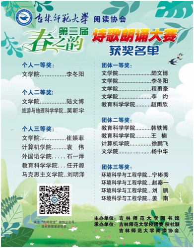 第三届“春之韵”诗歌朗诵大赛于4171830分在音乐厅举行,本次大赛旨在鼓励同学们愿意去发现和遇见那些动人的诗歌,丰富在校学生们的课余生活,传播青年们对诗歌的喜爱之情,增强我国传统文化的感染力。