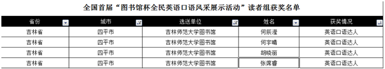 近日,由中国图书馆学会阅读推广委员会主办的全国首届“图书馆杯”全民英语口语风采展示活动圆满落幕,太阳成官网喜获佳绩。 此次活动历时近五个月,主题为“图书馆,让世界倾听”,分为“网络初选”、“网络复选”、“全国总展示”三个环节,通过“MET全民英语学习资源库”平台开展活动。全国共1317个图书馆参与组织,共有17万余名选手报名参加。
