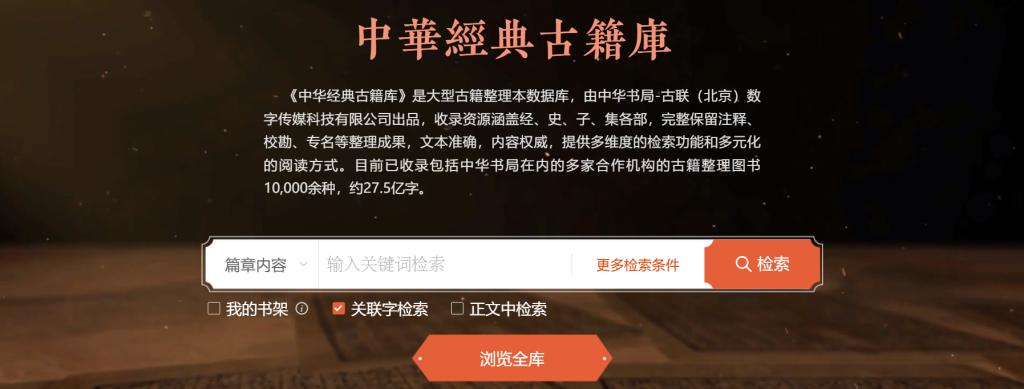 试用时间:2025年3月14日-2025年6月14日 访问地址:https://jingdian.ancientbooks.cn  产品简介 “籍合网”是国内首款古籍整理与数字化综合服务平台,由中华书局下属古联(北京)数字传媒科技有限公司负责建设和运营。“籍合网” 旗下整合了多种古籍类数字产品。《中华经典古籍库》是目前正在运营的重点产品。其资源以中华书局整理本古籍图书为核心,同时涵盖多家专业出版社的古籍整理成果。 资源数量与特色 《中华经典古籍库》计划每年推出一期数据。截至2024年12月,已完成十二期数据加工,总计10399种图书,约 27.5亿字。其中,前三期数据资源全部为中华书局出版的整理本古籍,从第四期开始收入其他出版社的优质资源。合作出版社包括凤凰出版社、巴蜀书社、齐鲁书社、华东师范大学出版社等 20 余家。 《中华经典古籍库》收录的资源涵盖经、史、子、集各部,包含二十四史、通鉴、新编诸子集成、十三经清人注疏、史料笔记丛刊、古典文学基本丛书、佛教典籍选刊等经典系列,资源保留了图书完整的前言、注释、校勘等整理成果,数据准确,内容权威。 《中华经典古籍库》提供了丰富的古籍数字化阅读、检索服务以及文史研究必备的辅助工具,特别提供了文本数据与原书图像的对照功能,并能自动生成包含页码信息的引用格式,省去了核对纸书的麻烦。在数据制作的过程中,更进行了额外的数字化编辑工作,修正了原书中的一些错误,对每一个标准字符集外的古籍用字一一进行了处理,保证了这些生僻字在计算机上能够被检索和显示。因此,在一定程度上说,《中华经典古籍库》的数据质量相较纸书更优。 功能特色 1. 自动生成引用格式。本产品所有资源均来自正规出版机构,可自动生成引用格式。用户选中要引用的文本后点击选择“引用”,系统将自动生成包括版本信息、所属页码的文本供用户粘贴使用。 2. 图文对照。该数据库提供原版图像与文字的全面对照,页码一一对应。网络版中图文对照的文字部分可实现横、竖版式切换,方便用户比对。 3. 支持生僻汉字的检索、显示与复制。《中华经典古籍库》专有字库除涵盖 unicode10.0 的全部汉字字符外,还自造 36000 余个编码字。支持显示说文小篆、古文字形、卦象符号等生僻字符。所有编码字,均可进行复制、检索。 |