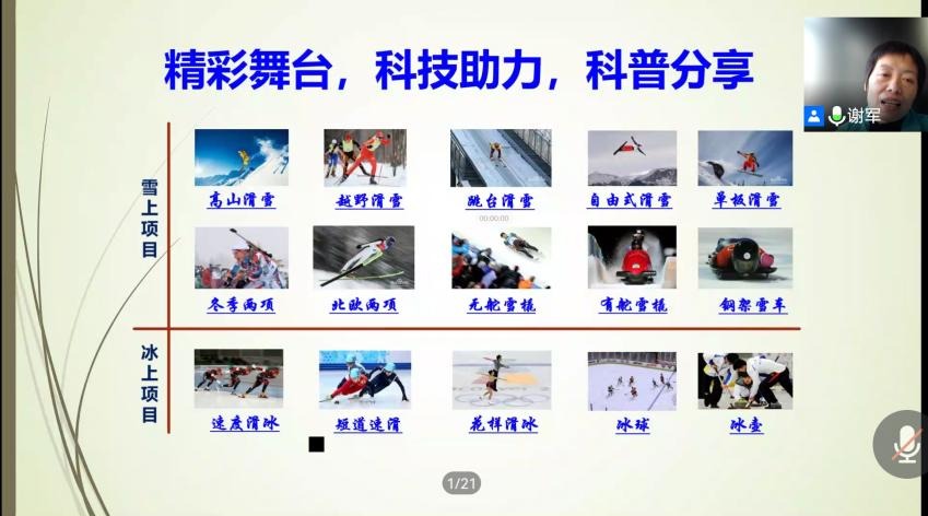 为进一步增强对科技在推广普及我国冰雪运动,为北京冬奥会、冬残奥会的筹办提供智力支持方面发挥重要作用,同时也进一步加深对冬奥会的理解,2021年10月13日下午,在双实楼417智慧教室,通过腾讯会议方式邀请到了首都体育学院副院长谢军教授进行了一场主题为“冬奥背景下的体育科研与科普”学术报告,本次报告由体育学院吉学武院长主持,体育学院全体师生聆听了报告。谢军,博士,首都体育学院副院长,教授,硕士生导师。亚洲国...