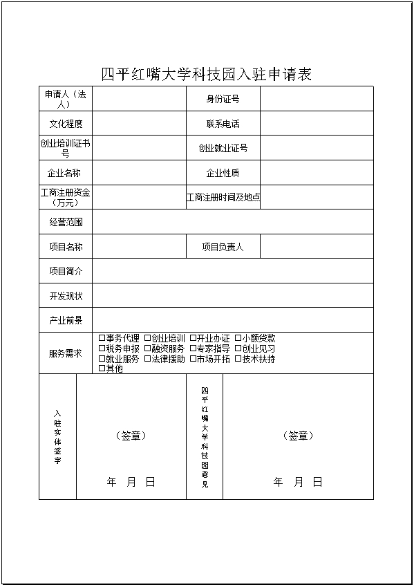 四平红嘴大学科技园入驻申请表-样表.xlsx