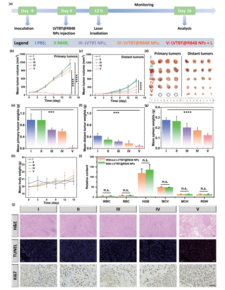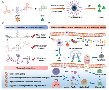 本研究设计并合成了具有平坦分子结构、宽吸收范围和强光捕获能力的LVTBT。LVTBT展现出明显的二面角旋转和更快的激发态衰变动力学,有助于非辐射跃迁过程,从而提升光热转换效率。随后,将LVTBT与TLR7/8激动剂R848协同构建LVTBT@R848纳米颗粒,在激光照射下作为“原位肿瘤疫苗”使用,不仅有效清除肿瘤细胞并诱导免疫原性细胞死亡,还促进了损伤相关分子的释放、抗原递呈、树突状细胞成熟及T细胞浸润,显著激活系统性免疫反应。体内实验表明,该策略对原发肿瘤和远端肿瘤的抑制率分别达97.74%和81.2%,并有效阻止了肺部转移,显示出良好的治疗前景。