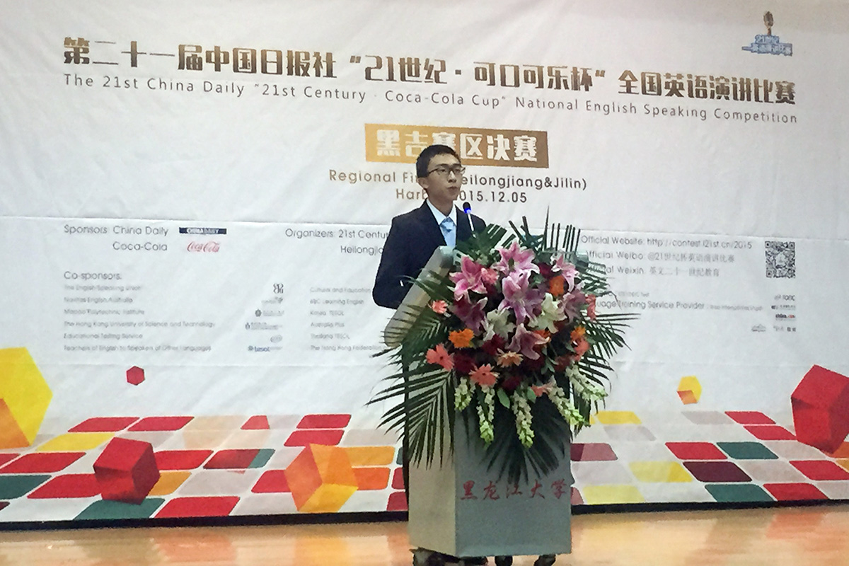 2015年12月5日,在黑龙江大学举办的第二十一届中国日报社“21世纪•可口可乐杯”全国英语演讲比赛黑吉赛区决赛中,我院商务英语专业2015级郭俊铭同学获得决赛三等奖的好成绩。第二十一届中国日报社“21世纪•可口可乐杯”全国英语演讲比赛黑吉赛区决赛共有30名来自黑龙江省、吉林省各高校的选手代表本校参加决赛。在胡晓丽老师和潘雁老师的指导下,我院2015级郭俊铭同学进入最后决赛,获得三等奖,彰显了澳门太阳成集团外国语学院商务英语专业学生过硬的专业技能!