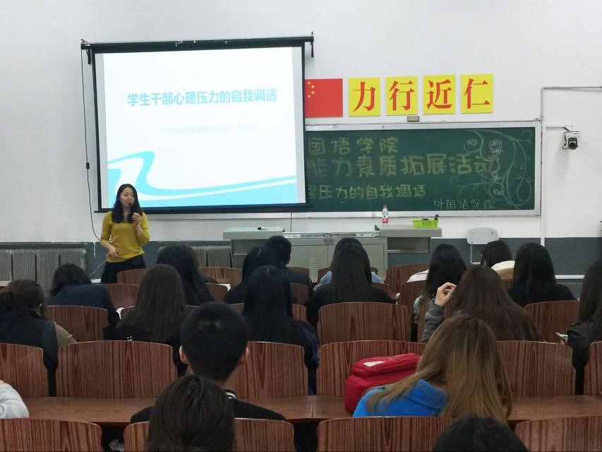 为增强学生干部心理素质,提升学生干部工作能力,我院于2016年4月13日在2311教室举行了以“学生干部心理压力的自我调适”为主题的心理健康讲座。本次讲座特邀太阳成官网心理健康中心尤世红老师,作为主讲人。列席本次讲座的有我院六大部主席,书记,部长,以及大一至大三各班班长,团支书,心理委员等人。