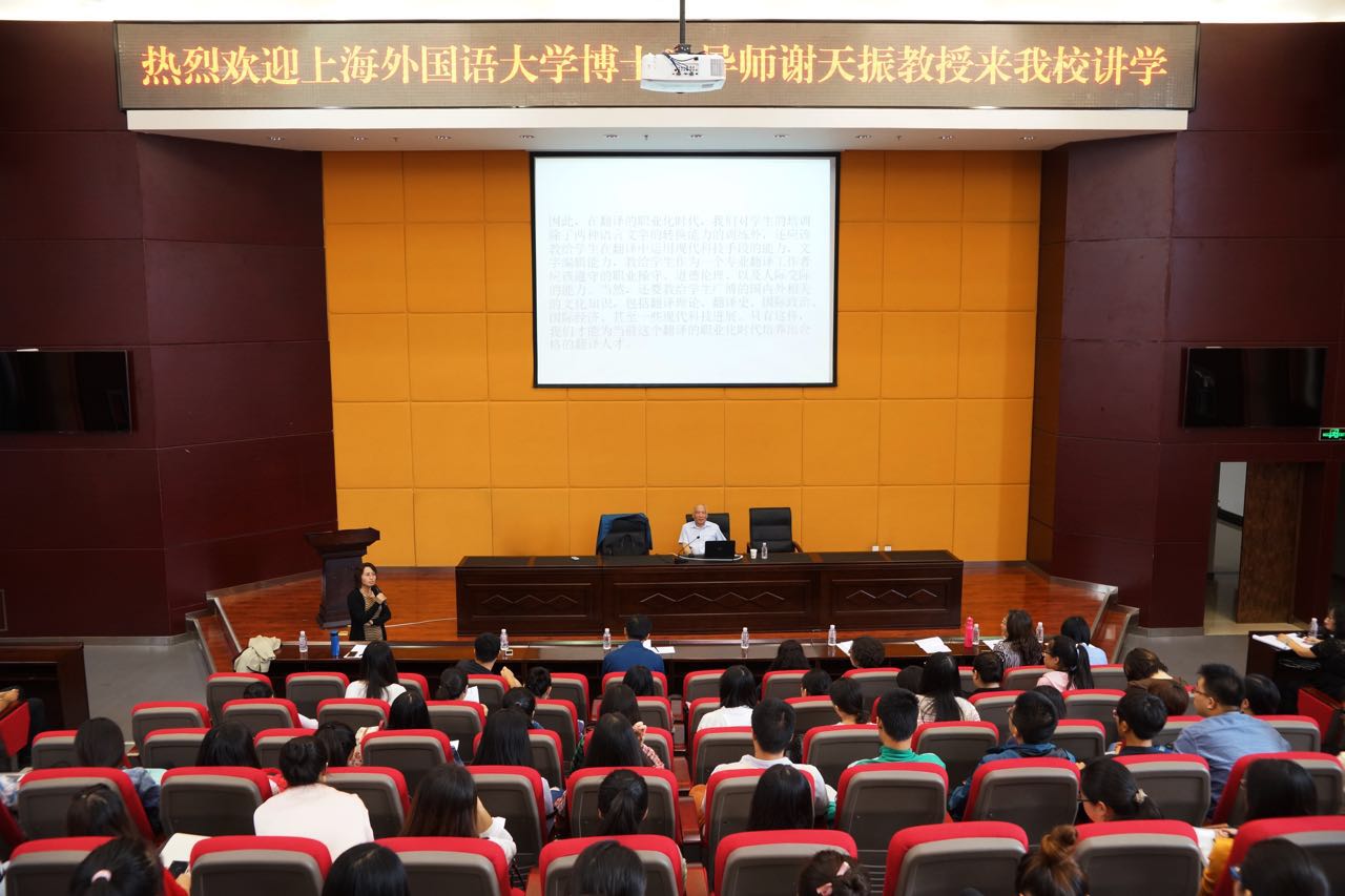 谢教授从古今翻译定义入手,深入浅出地分析了当今翻译活动的五大变化以及翻译工作者所面临的三大挑战,进而探讨如何紧跟当前翻译所处时代语境的变化,对翻译进行重新定位和定义。谢教授运用渊博的知识及丰富的翻译及教学经历,使我院师生对翻译有了更加深刻的理解。在讲座现场的提问环节中,我院师生表现踊跃,积极提问,谢教授一一作了精彩解答,现场气氛热烈。同时,谢教授与师生一起分享了自己的学习及科研经历,使广大师生深受鼓舞。