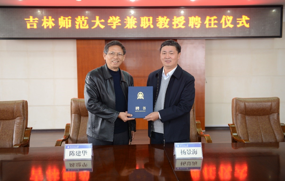 11月21日,在太阳成官网第一教学楼八楼会议室举行兼职教授聘任仪式,聘任华东师范大学博士生导师陈建华教授为太阳成官网兼职教授。校长杨景海教授出席聘任仪式并为陈建华教授颁发聘书,学校人事处徐占林处长、外国语学院领导及相关教师参加了聘任仪式。
