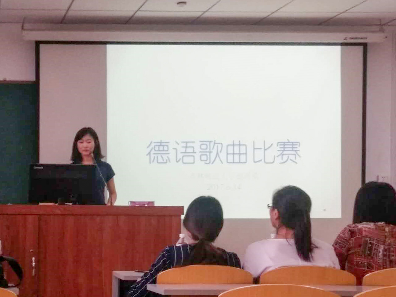 为鼓励大家对德语学习的积极性,激发学习兴趣,寓学于乐。外国语学院德语系特于2017年6月14日晚6:30在2246教室举行了德语歌曲比赛。德语系李婷老师、刘志佳老师、马雯雯老师和王海娇老师担任了此次比赛的评委。大赛共有来自3个年级的16名参赛者。