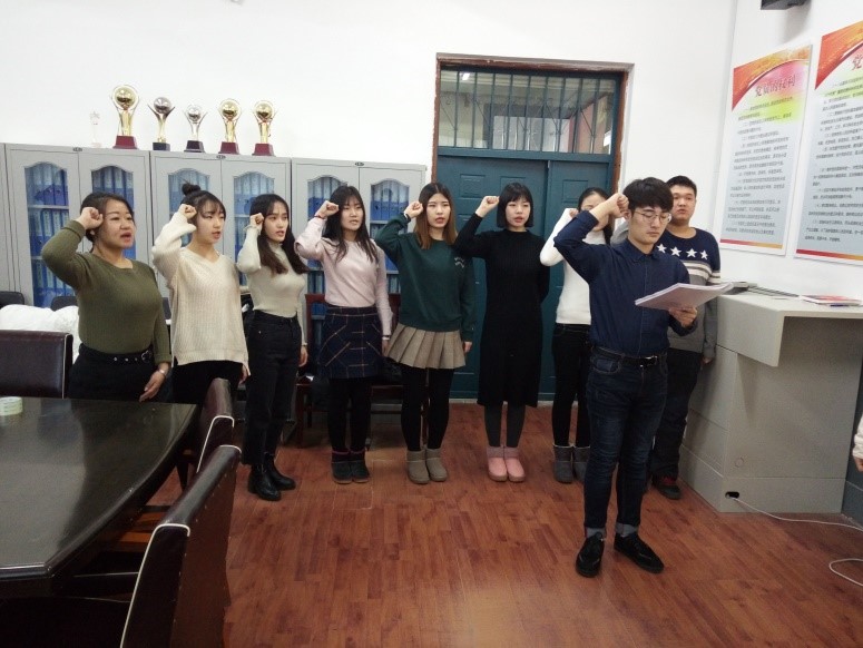 在南京大屠杀死难者国家公祭日之际,2017年12月13日澳门太阳成集团外国语学院在第二教学楼党员活动室举行了2017年下半年新发展党员的入党宣誓仪式。仪式由学生党支部书记胡晶主持,在庄严雄浑的《国际歌》旋律后,8名预备党员举起右拳,面向鲜红的党旗,庄严宣誓。每个预备党员都用发自内心的声音抒发对党忠诚的决心,在这特殊的一天,新党员接受了一次身心的洗礼。