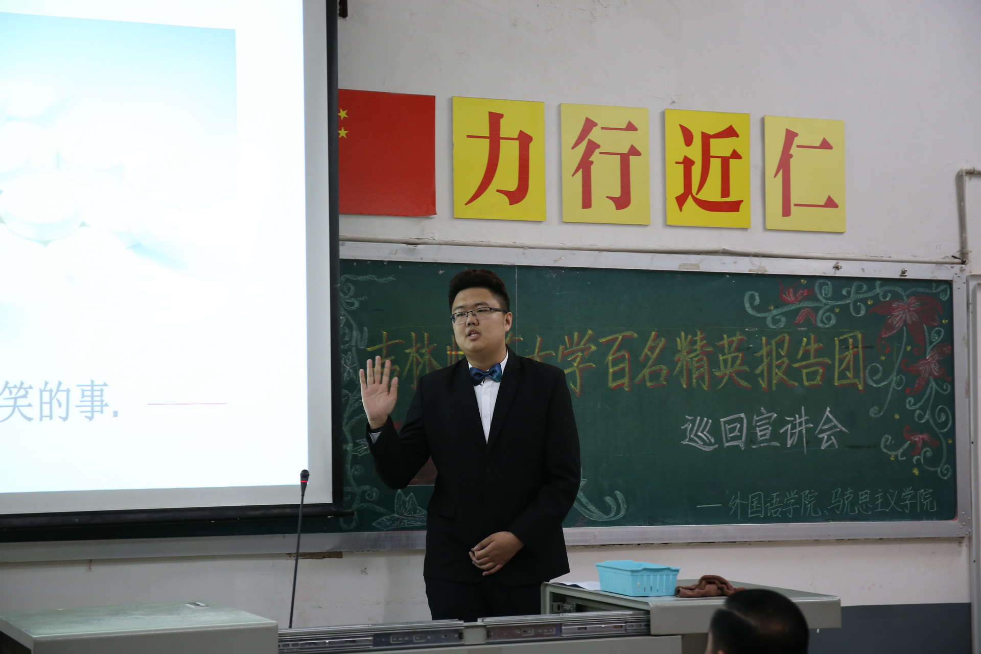为进一步推进双百计划,发挥先进榜样的示范引领作用。3月21日晚,学院联合马克思学院在2311教室举办了“澳门太阳成集团百名精英报告团”巡回宣讲会。出席本次会议的有外国语学院党委副书记韩强,辅导员陈龙涛以及马克思主义学院团委副书记宋彦喜。报告团成员分别是“学干精英”——历史文化学院肖钧伟、外国语学院曲彦姣,“学习精英”——外国语学院王业鑫、历史文化学院马一然,以及“士兵精英”——马克思主义学院张文金。