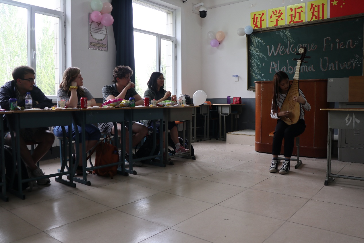 在主持人徐建葳同学向外国朋友们表达了诚挚的欢迎之后,活动正式开始。活动上半场,英语系曲彦姣、徐建葳同学分别演奏了琵琶曲《送我一首玫瑰花》、吹奏了口琴曲美国小调《哦,苏珊娜》,梁媛同学向美国大学生介绍了中国的古代四大发明以及新四大发明,赢得了赞赏。活动下半场,双方就中美大学生的学业压力、影视剧欣赏和旅游见闻等主题展开了交流。在交谈中,美国大学生表达了对汉语学习的热爱,并纷纷赞叹中国高铁的便捷、快速和舒适。之后,双方进入游戏互动环节,在欢快的氛围中,增进了中美大学生之间的友谊。活动最后,英语系学生向美国大学生赠送了中国特色的小礼品作为此次活动的纪念。