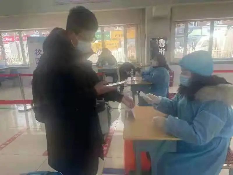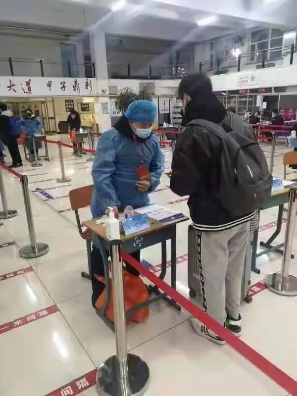 在桃园餐厅志愿服务站,志愿者们对行李进行全面消毒,并指引学生走上专属通道,更换口罩、检测体温、核酸检测并指引学生依次出示“吉祥码”“通信大数据行程卡”“入校通行码”。有序出示身份证以及电话号码,完成入校最后一道程序。