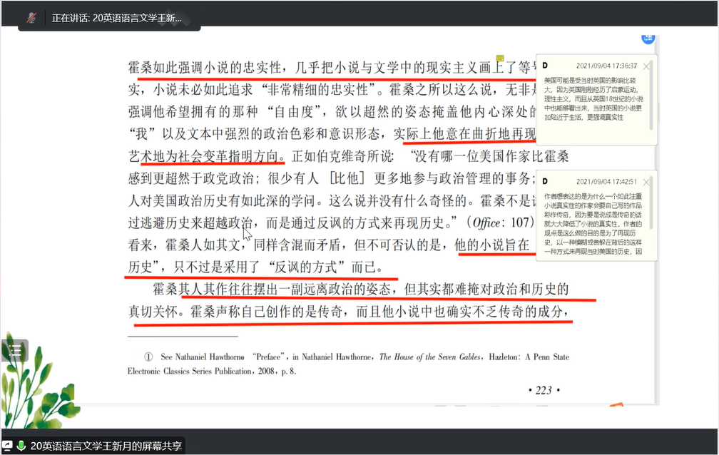 20级英语文学方向王新月同学以“关于文献的那些事”为主题,从查找文献、阅读文献、整理文献三方面阐述了高效阅读文献方法,强调阅读文献要有批评视角和问题意识,并随时记录灵感,为论文选题提供思路。