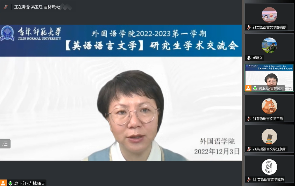 为营造研究生的学术氛围,展现研究生积极向上的精神风貌,促进研一新生尽快适应研究生的学习生活, 12月3日上午,学院线上举办英语语言文学专业研究生学术交流会。交流会邀请研三和研二年级6名学生代表进行经验分享。会议由英语文学研究方向负责人高卫红教授主持,英语语言所所长崔建立教授及相关教师出席,全体英语语言文学研究生参会。