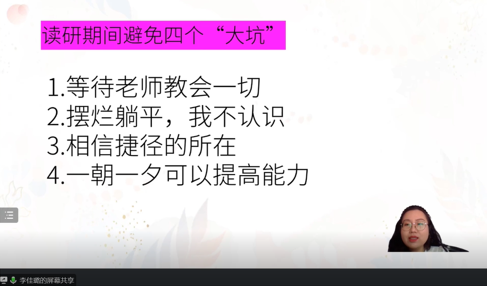 20级英语语言学方向李佳璐同学分享的主题为“教你写好毕业论文”。她从确定选题、查找材料、文档下载、阅读和整理材料、正式行文等方面讲解了学位论文撰写、行文框架和写作技巧,鼓励大家读研期间自主学习、惜时如金,做自己学术研究中的英雄。