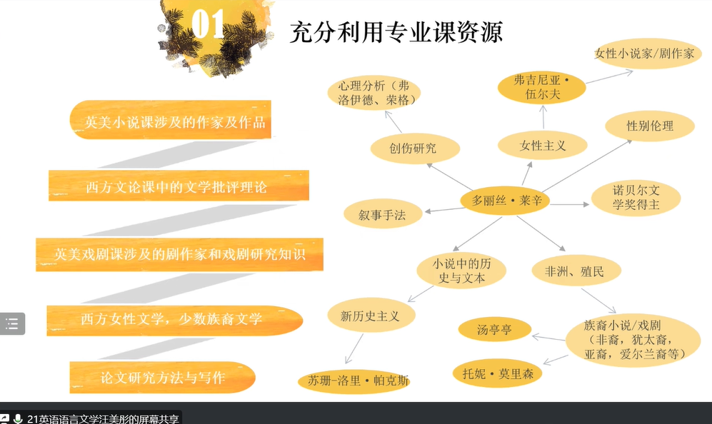21级英语文学方向汪美彤同学从课程学习、文献收集、文献阅读和寻找研究方向四方面进行分享,指出读研期间要充分利用课上资源,梳理研究内容、扩展研究方向,明确研究目标;通过知网、学习通和公众号等线上资源,获取前沿学术动态,有选择地略读和精读文献。