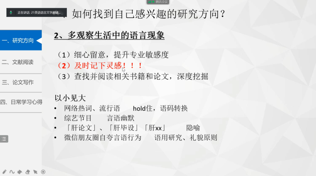 20级英语语言学方向姜玲同学从文献检索、期刊选择、文献阅读和论文写作四方面进行经验分享。她推荐了多个文献检索网站和文献管理工具,强调多阅读影响因子高、高被引的期刊文献,指出阅读文献是一项长期积累的过程,持之以恒,定能收获满满。