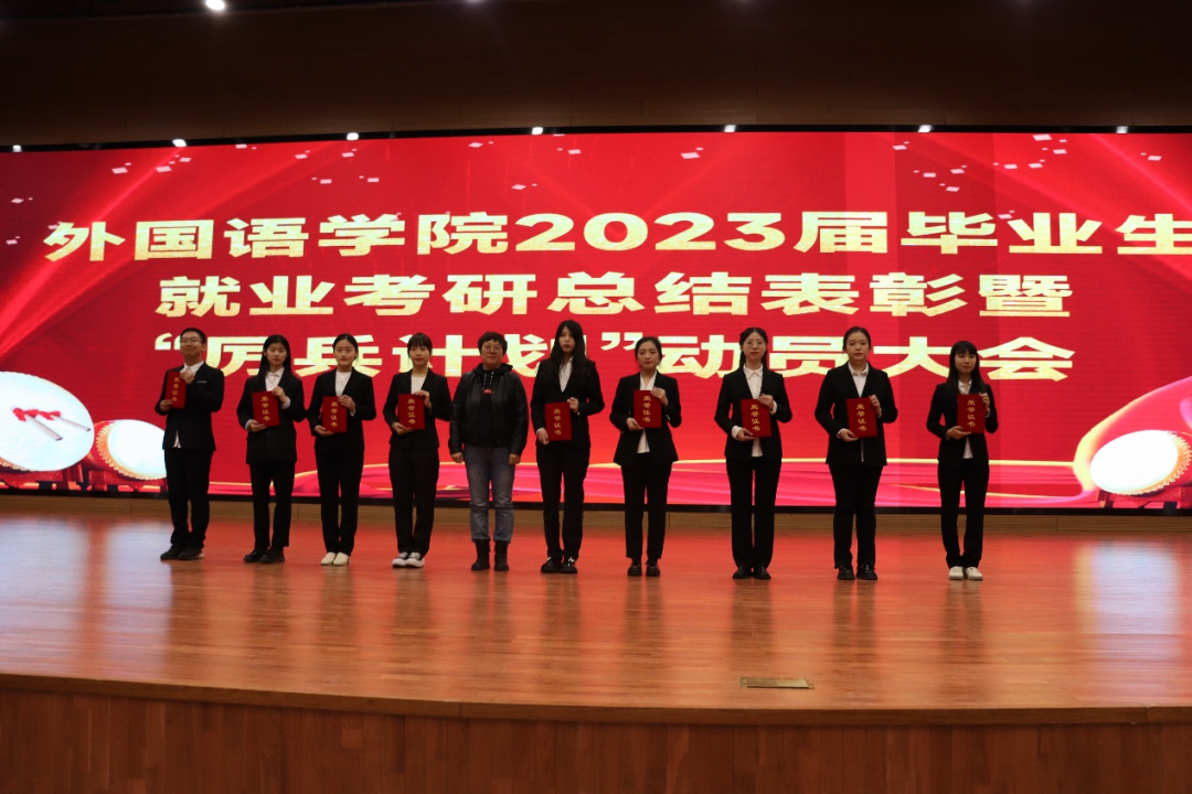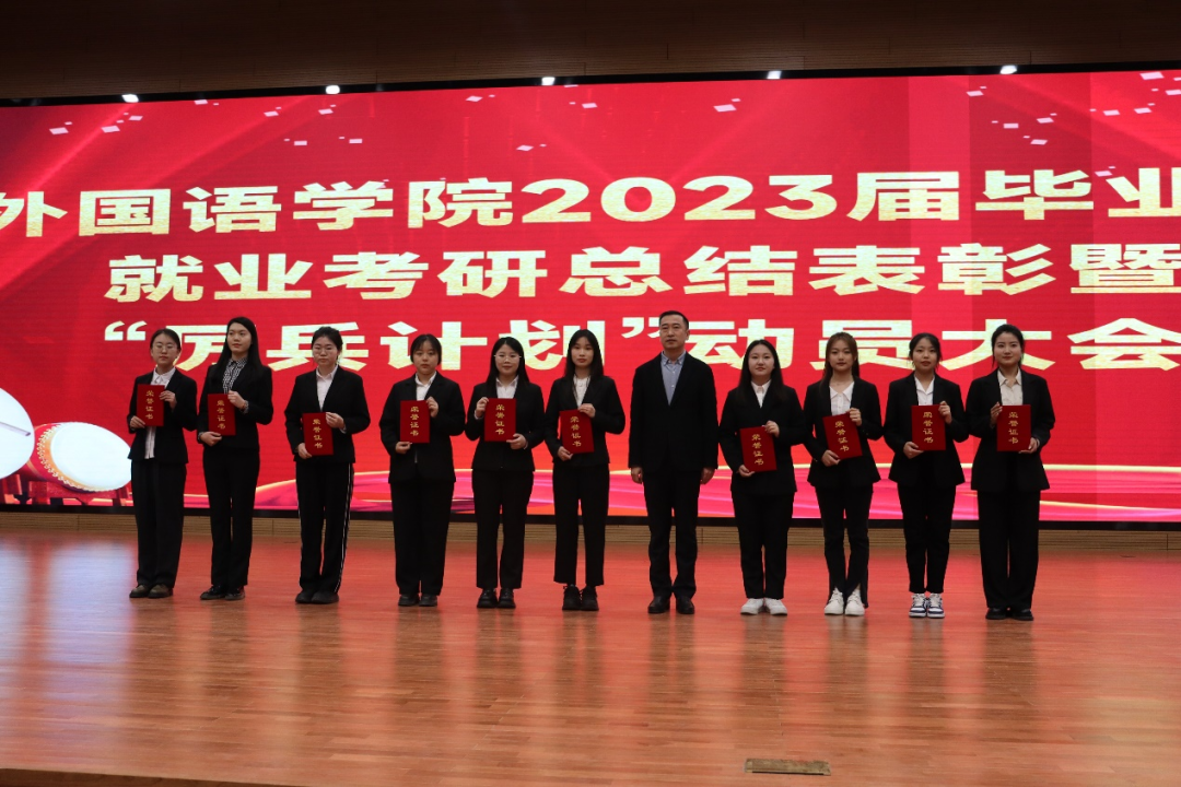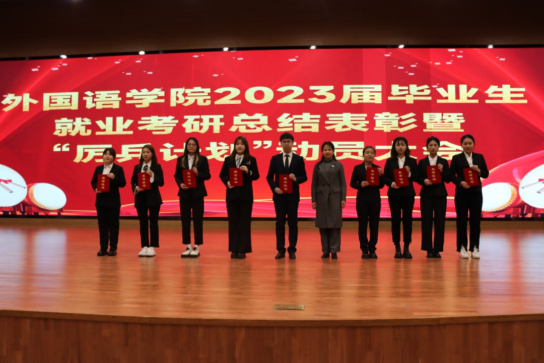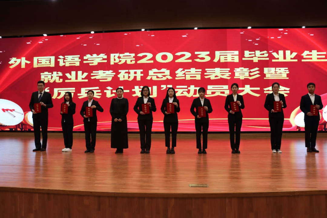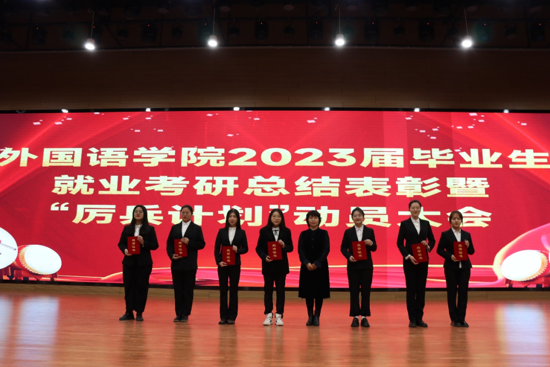为深入贯彻党的二十大精神,积极落实“毕业生更充分更高质量就业”,充分调动2023届毕业生就业积极性,进一步做好2024届毕业生就业推进工作。4月27日晚,学院以线上线下相结合的形式在千人报告厅召开“2023届毕业生就业考研表彰暨‘厉兵计划’动员大会”。院长李淑华、党委书记韩强、副院长赵岩、李艳红、潘雁,党委副书记胡晶出席会议,英语系主任胡晓丽、俄语系主任王春红、日语系主任刘丽芳、教师第二支部书记许春花,团委书记范妙然、辅导员柳铭钰、陈健飞,2019级学生代表、2020级、2021级、2022级全体学生参加会议。会议由胡晶主持。