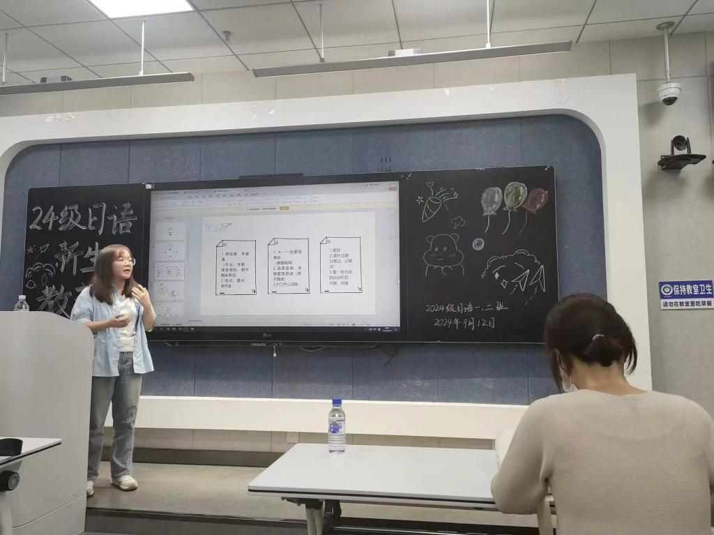 为增进新生间的相互了解,激发大家对日语学习的热情,同时也为即将开启的大学生活奠定坚实的基础,9月12日晚,日语系在11908教室举办了2024级日语新生学业培训会。日语系主任刘丽芳,专任教师聂亮、李雯、金煜出席会议。日语系全体新生及部分班代参加会议。会议由刘丽芳主持。