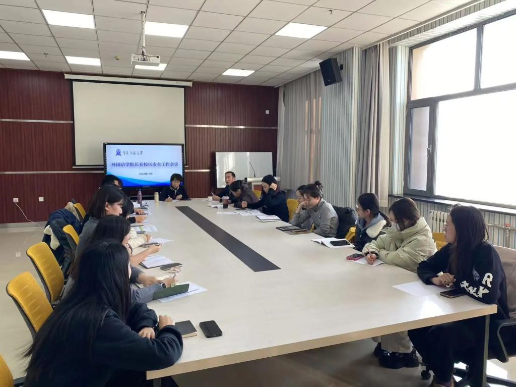 11月22日下午,学院长春校区在研发大厦会议室召开安全工作会议。院长李淑华、党委书记韩强、党委副书记胡晶、中外语言与文化比较研究中心副主任谭晓闯, 德语系主任于博、西语系主任马肖琬,学院长春校区办公室主任王一涵,辅导员丛智超出席会议,两个专业全体教师参加了会议。会议由李淑华主持。