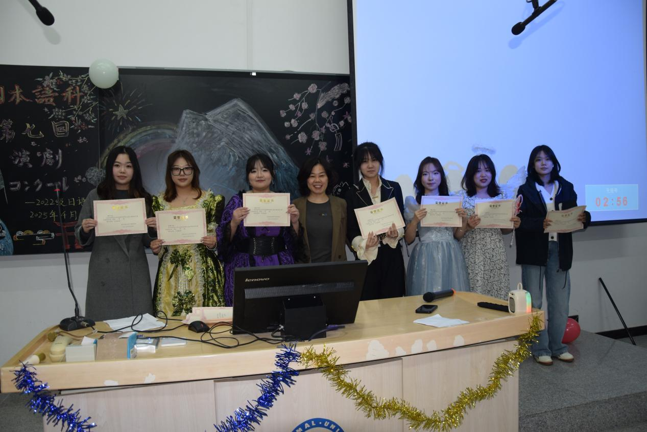 在所有小组完成表演后,由日语系的老师们为获奖小组颁发荣誉证书,现场掌声雷动,欢呼不断。随后,仓片老师代表评委发表总结讲话,对所有参赛同学的表现给予了高度评价,认为本届戏剧大赛无论是剧本内容、舞台表现,还是语言运用与团队配合,都展现了极高的水平与热情。