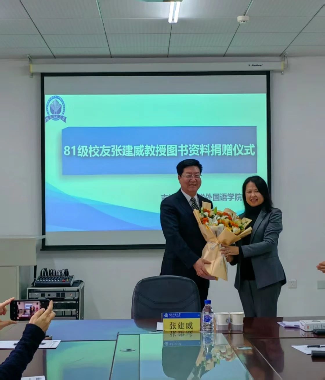 在捐赠仪式上,李淑华首先代表学院,对张建威来院讲学并捐赠表达了诚挚的欢迎与感谢,同时代表学院接受了张建威校友的捐赠。她指出,张建威作为本院的优秀校友,同时兼任学院英语翻译硕士校外行业导师,始终情牵母校,这份情怀与精神令人钦佩,值得大家学习。此次捐赠意义重大,将为师生的教学与科研工作提供有力支持,助力学院迈向高质量发展之路。