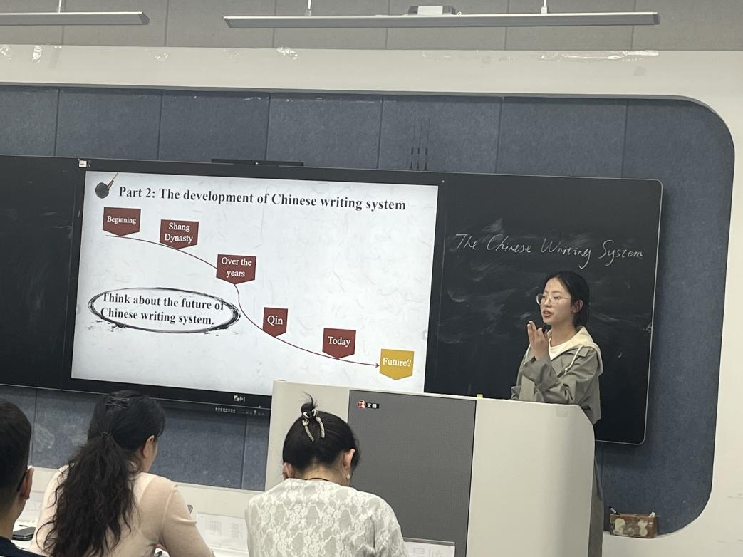 比赛现场,参赛选手们各展风采。在语言表达、课件制作、板书设计、教学活动安排等方面体现了学科教学(英语)专业研究生扎实的教学基本功。