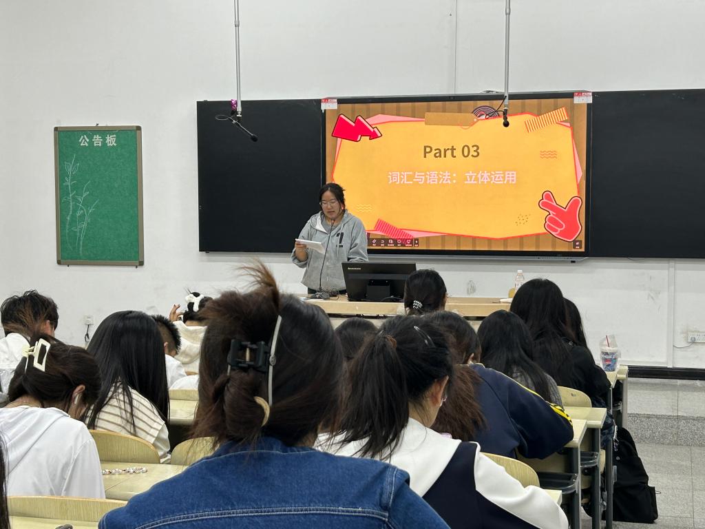 会上,刘文月率先发言,她结合自身参赛经历,详细介绍了全国大学生英语竞赛的题型特点与考察重点。刘文月强调,扎实的词汇基础是关键,建议同学们通过阅读英文原著、观看英文影视剧等多元化方式积累词汇,并分享了自己制定的科学背词计划。同时,她还针对听力、阅读、写作等题型,分享了独特的解题技巧与训练方法,为同学们指明了备考方向。