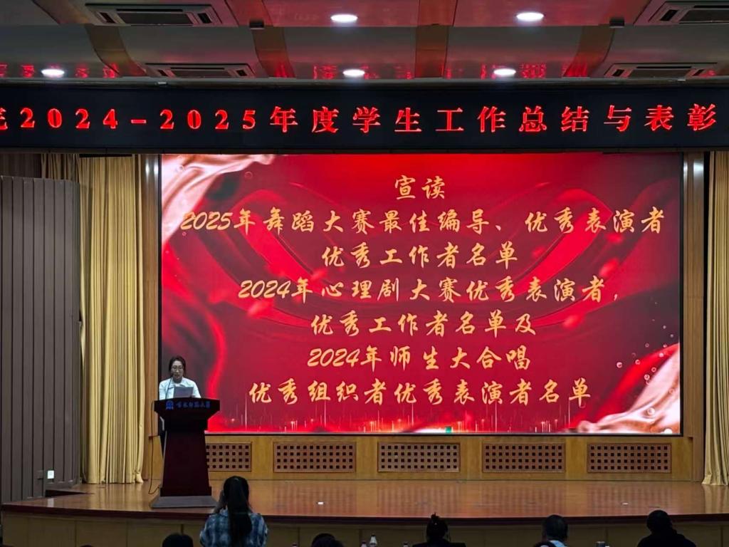 柳铭钰宣读2025年舞蹈大赛最佳编导、优秀表演者、优秀工作者名单;2024年心理剧大赛优秀表演者,优秀工作者名单;2024年师生大合唱优秀组织者、优秀表演者名单