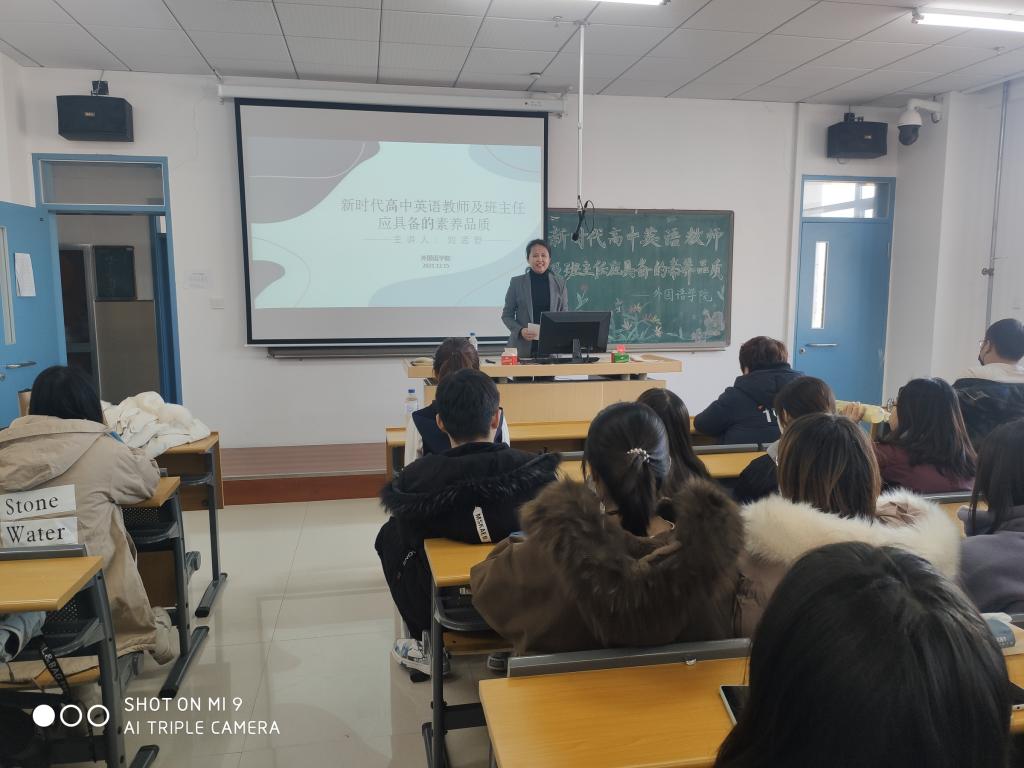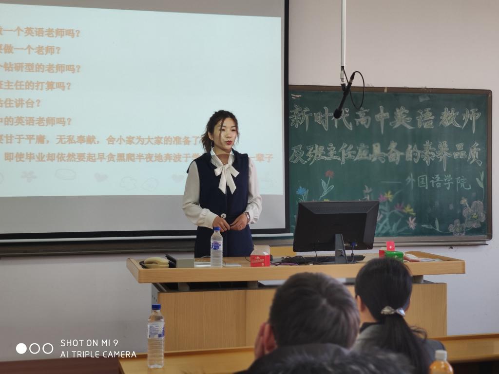 刘孟野老师结合自身教学实际从“研究如何上好英语课”“研究如何做一个优秀的班主任”两个方面为学生们分享经验,使学生们更加深入的了解了高中英语教学和班主任工作的内容及重要性。