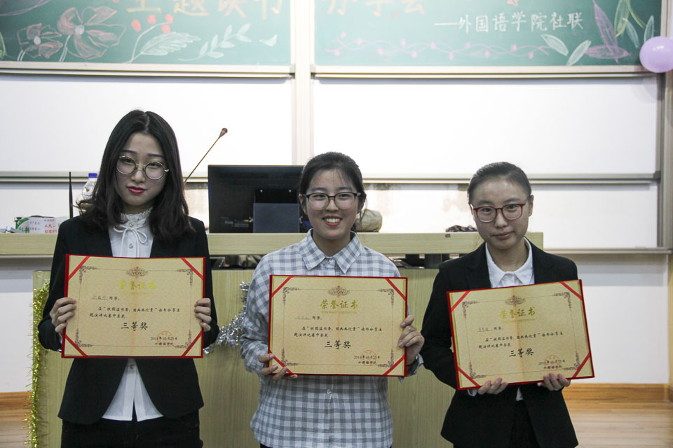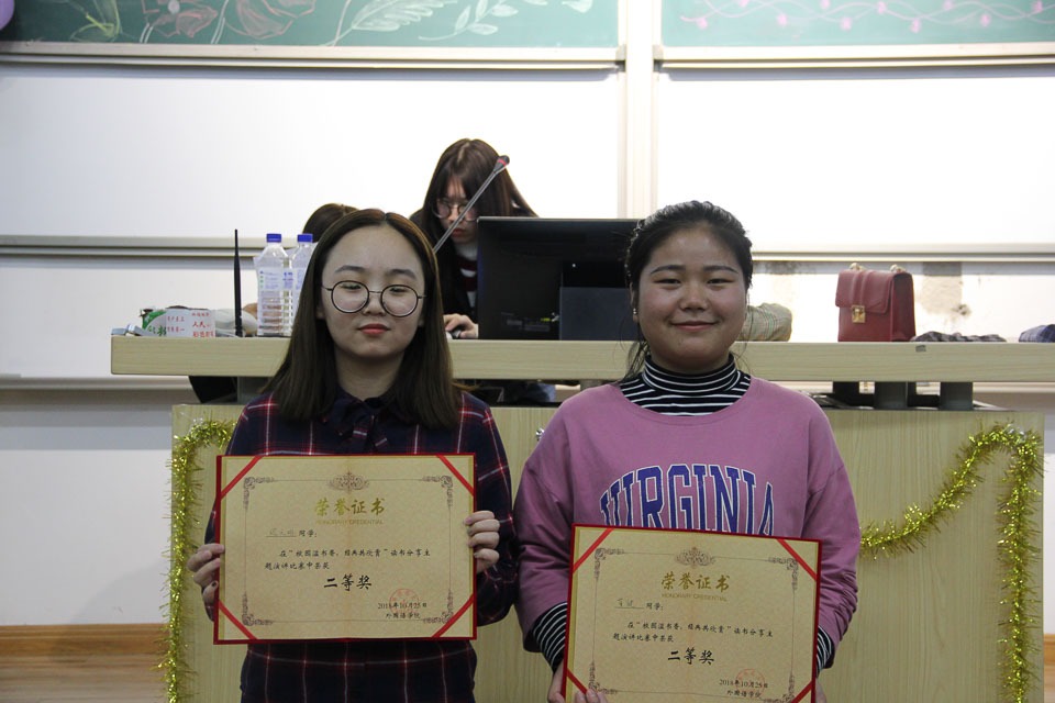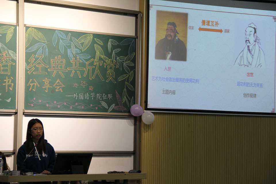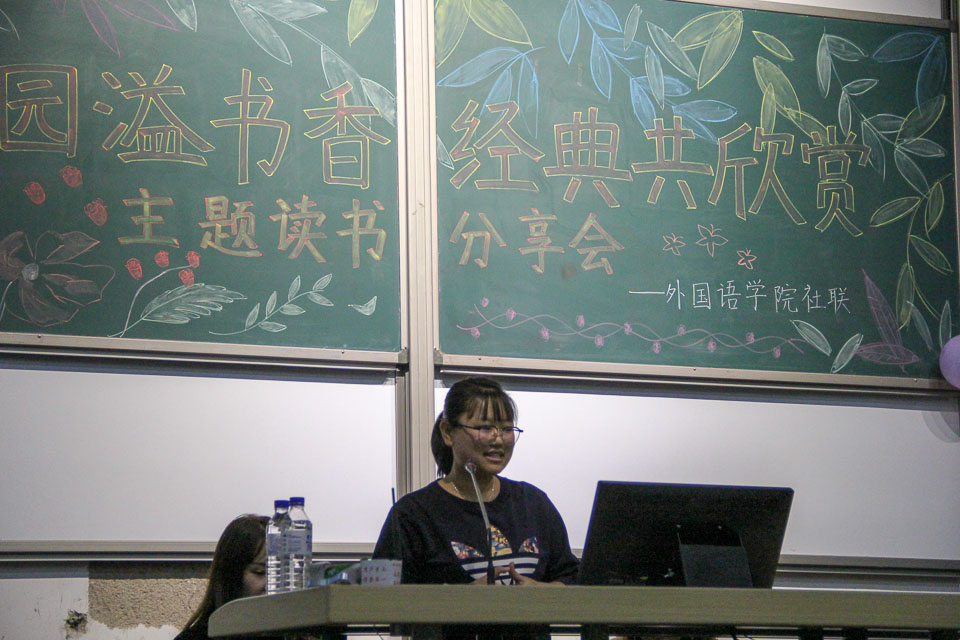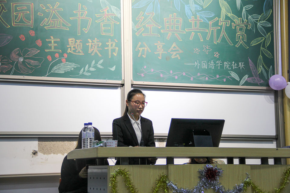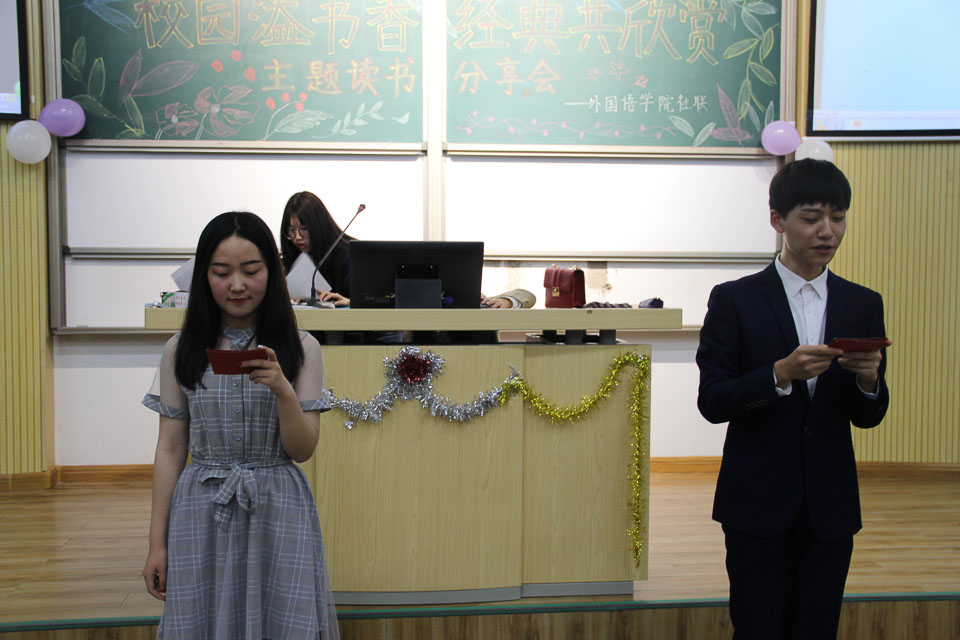 为有效加强学风建设,深入推进“阅享经典、读书盛宴”系列活动,引导学生与书本为友、同大师对话,逐步营造“好读书、爱读书、读好书”的文化氛围。10月25日晚,外国语学院在6103教室举办“校园溢书香,经典共欣赏”主题读书分享活动。本次活动由学院社团联合会承办,2017级学生参加。