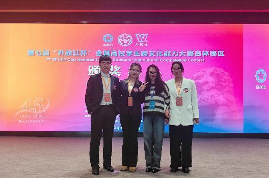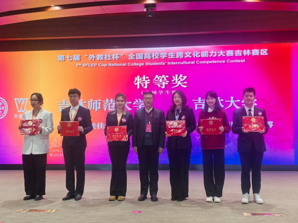 第七届“外教社杯”全国高校学生跨文化能力大赛吉林赛区决赛于11月9日至10日在东北师范大学成功举办。在全省26支代表队中,我院代表队李宇豪(2023级英语笔译)、侯佳希(2022级物理专业)、高宇婷(2023级化学专业)在刘冬霞、胡晓丽老师的指导下,以总名次第2名的成绩获特等奖,将于12月初在上海与吉林大学一起晋级全国决赛。