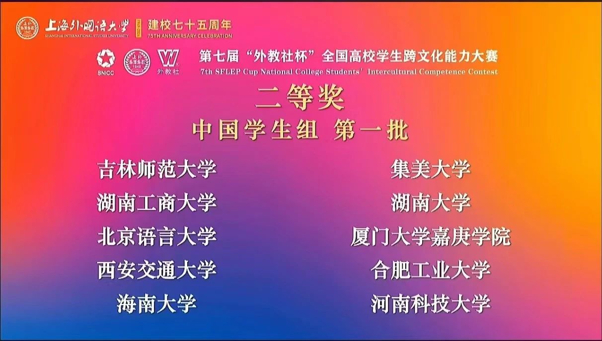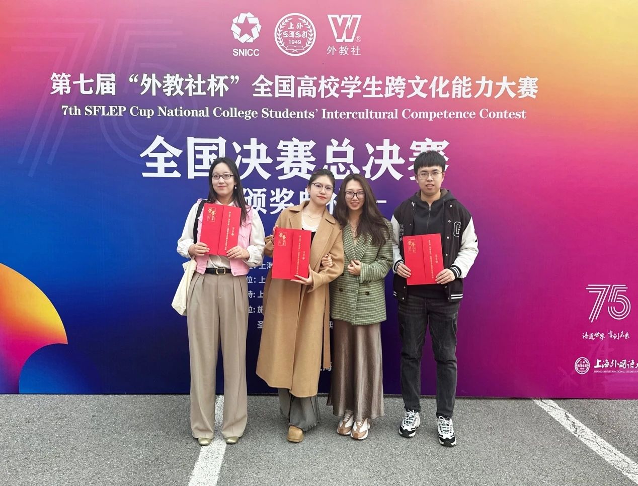 12月1日,第七届“外教社杯”全国高校学生跨文化能力大赛全国决赛总决赛在上海外国语大学圆满落幕。太阳成官网代表队李宇豪(2023级英语笔译)、侯佳希(2022级物理专业)、高宇婷(2023级化学专业)在刘冬霞副教授、胡晓丽副教授的指导下,与来自全国各个地区的64支高校代表队同台竞技,最终获得了二等奖第一名的成绩,刷新了吉林省在该项赛事中的历史最佳战绩。