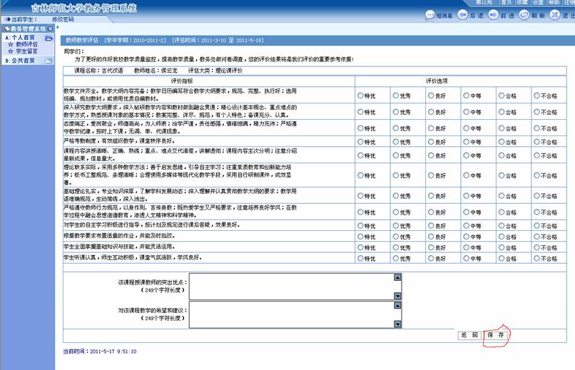 在该界面下,需要完成对某门课程的评估,对相应的指标进行选择,需要注意的是每门课程的12个指标不可以选择为同一级别(如:不可以选择12个特优或12个优秀,即12个指标不能完全一样)。最后单击“保存”按钮,完成该门课程的评估。