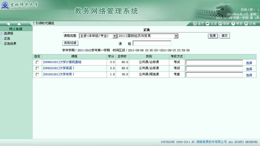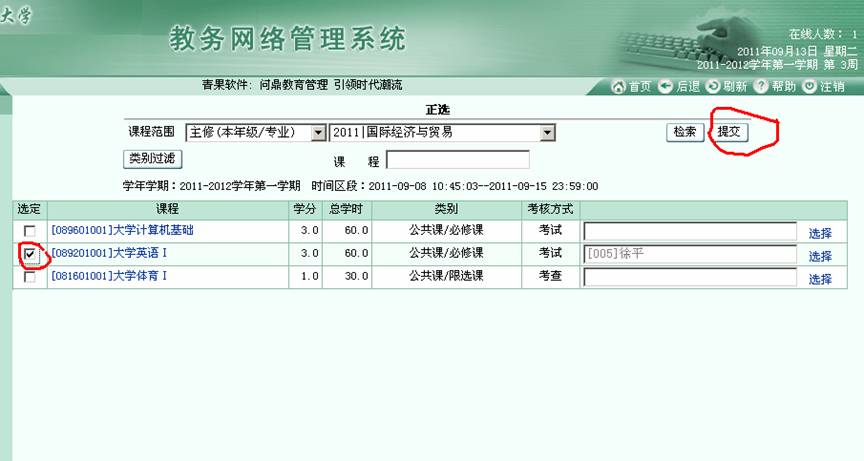 7.单击确定按钮。返回到如下图所示的界面后,勾选已选的课程,然后单击提交按钮,即完成该门课程在选课。