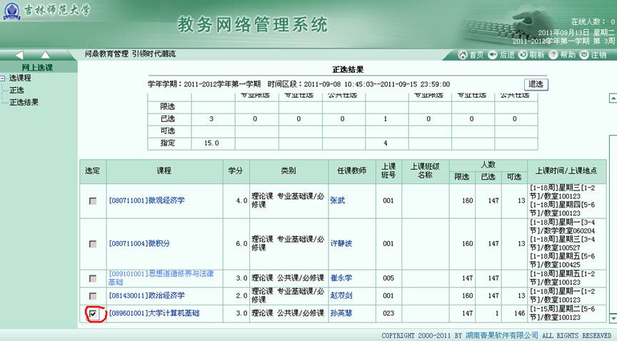 9.退选如果在选课过程中出现错选的情况,可以进行退选。首先选中要退选的课程,然后单击退选按钮,就可以完成退选课程。
