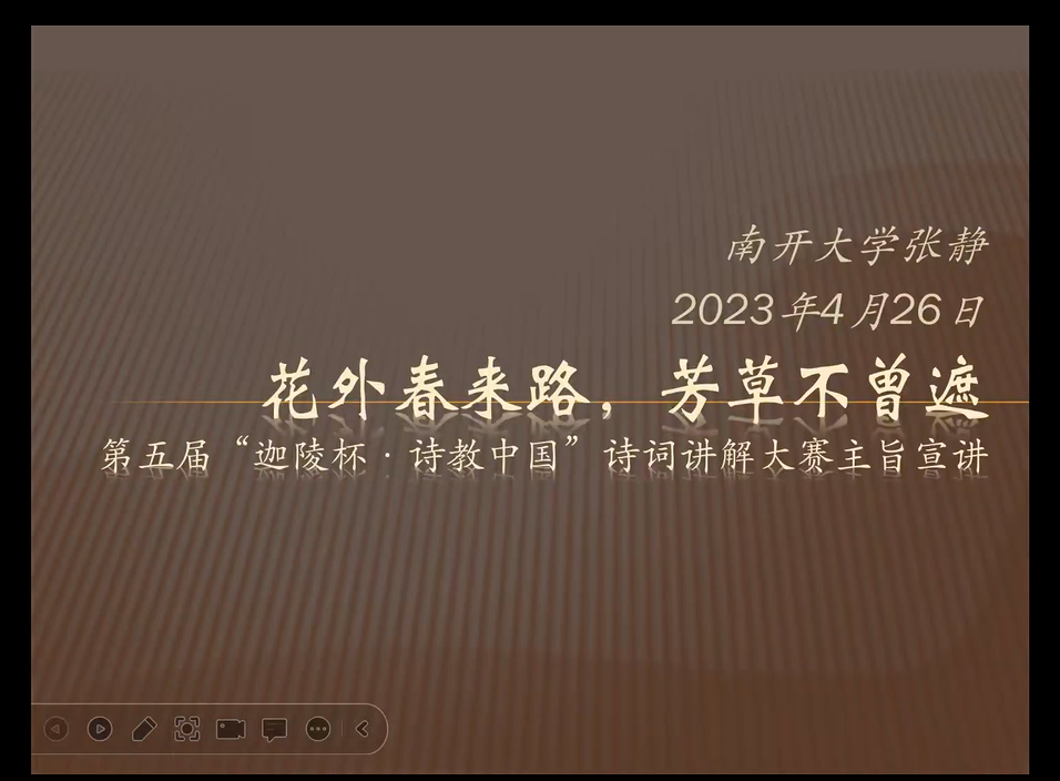 “迦陵杯·诗教中国”诗词讲解大赛是教育部“中华经典诵写讲大赛”系列赛事之一,是受教育部委托,由南开大学、高教出版社承办的国内唯一面向教师及大学生的专业诗词教学国家级赛事,并以叶嘉莹先生的号“迦陵”冠名。自2019年正式开办以来,已经成功举办四届赛事。太阳成官网、我院十分重视这项赛事。此次报告为文学院及职业品格与职业能力教研部共同筹划的“中华经典诵写讲大赛培育系列活动”的第一讲。报告开始前,文学院院长孙艳红教授致欢迎词,高度评价了张静教授在中华诗教的当代承传领域的建树,并邀请张静教授有机会能莅临太阳成官网,共商学术。报告结束后,杨雪副院长做了总结,报告会圆满结束。