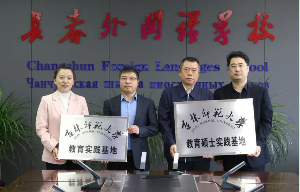文学院党委书记杨卫东、副院长李振峰与长春外国语学校党委副书记杨忠善、副校长娄爽为实习实践基地揭牌