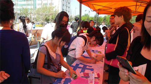 在2个多小时的签名活动中,约有3000余名师生到现场进行了签名,来自管理学院、外国语学院、数学学院、计算机学院、体育学院和音乐学院的心灵使者共发放了5000余份心理健康知识宣传彩册。